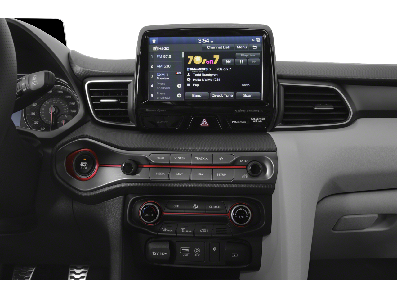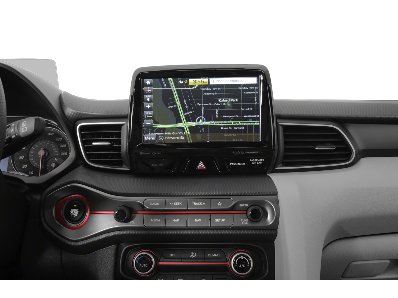 - Radio: AM/FM 8" Display Audio -inc: Infinity premium audio w/external amp, 8 speakers including subwoofer, SiriusXM satellite radio, Bluetooth® hands free phone w/voice recognition, Apple CarPlay, Android Auto, Blue Link (Gen2), rearview camera w/dynamic guidelines, Smartphone/MP3 auxiliary input jack, dual USB chargers and speed sensitive auto volume control