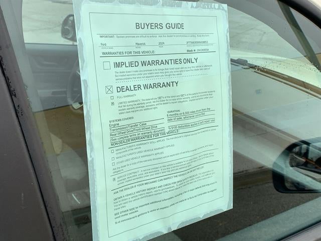 3.63 Axle Ratio, 4-Wheel Disc Brakes, 400W Inverter w/USB Console Rear, 6 Speakers, 6.5 Productivity Screen in Instrument Cluster, ABS brakes, Alloy wheels, Auto High-beam Headlights, Automatic temperature control, Brake assist, Bumpers: body-color, Compass, Delay-off headlights, Driver door bin, Driver vanity mirror, Dual front impact airbags, Dual front side impact airbags, Electronic Stability Control, Equipment Group 300A Standard, Exposed Front Tow Hooks, Exterior Parking Camera Rear, Four wheel independent suspension, Front anti-roll bar, Front Bucket Seats, Front Center Armrest, Front reading lights, Fully automatic headlights, FX4 Off-Road Package, Heated Mirror w/Painted Black Skull Caps, Heated Seats, Higher Capacity Radiator, Hill Descent Control, Illuminated entry, Knee airbag, LED Box Lighting, Low tire pressure warning, Modular Hard Drop-In Bedliner, Occupant sensing airbag, Outside temperature display, Overhead airbag, Overhead console, Panic alarm, Passenger door bin, Passenger vanity mirror, Performance Suspension, Power door mirrors, Radio data system, Radio: AM/FM Stereo w/6 Speakers, Rear anti-roll bar, Rear seat center armrest, Rear step bumper, Remote keyless entry, Remote Start System, Security system, Soft Vinyl Wrapped Heated Steering Wheel, Speed control, Speed-sensing steering, Steering wheel mounted audio controls, Tachometer, Tilt steering wheel, Traction control, Trailer Hitch Receiver w/4-Pin Connector, Unique Cloth Front Bucket Seats, Upgraded Cooling Fan, Wheels: 17 Carbonized Gray Painted Aluminum, Wheels: 17 Unique Ebony Painted Aluminum, XLT Luxury Package.2024 Ford Maverick XLTClean CARFAX.
